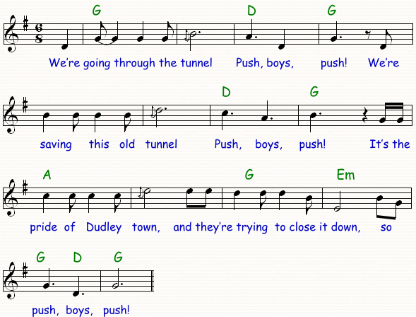 The words to "Push Boys Push" were written, circa 1966, during a trip through Dudley Tunnel by Glyn Phillips and