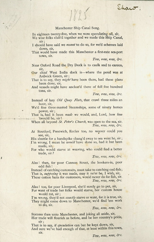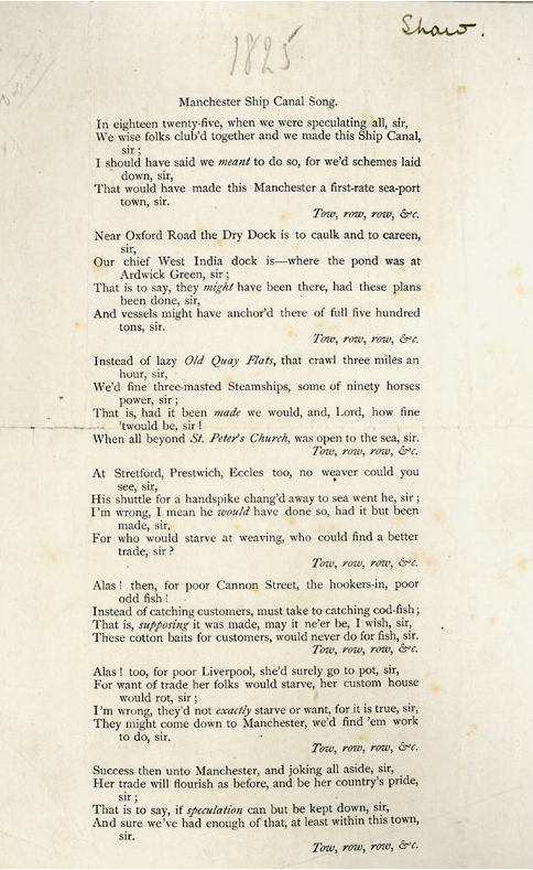 Manchester Ship Canal SongOriginally from Notes and Queries, March 12 1881, Manchester Reference Library.From the Manchester Ship Canal Miscellany (GB124.B10) held in Manchester Archives.